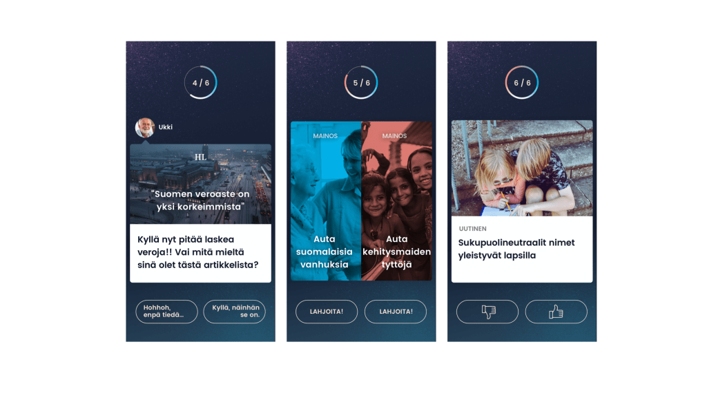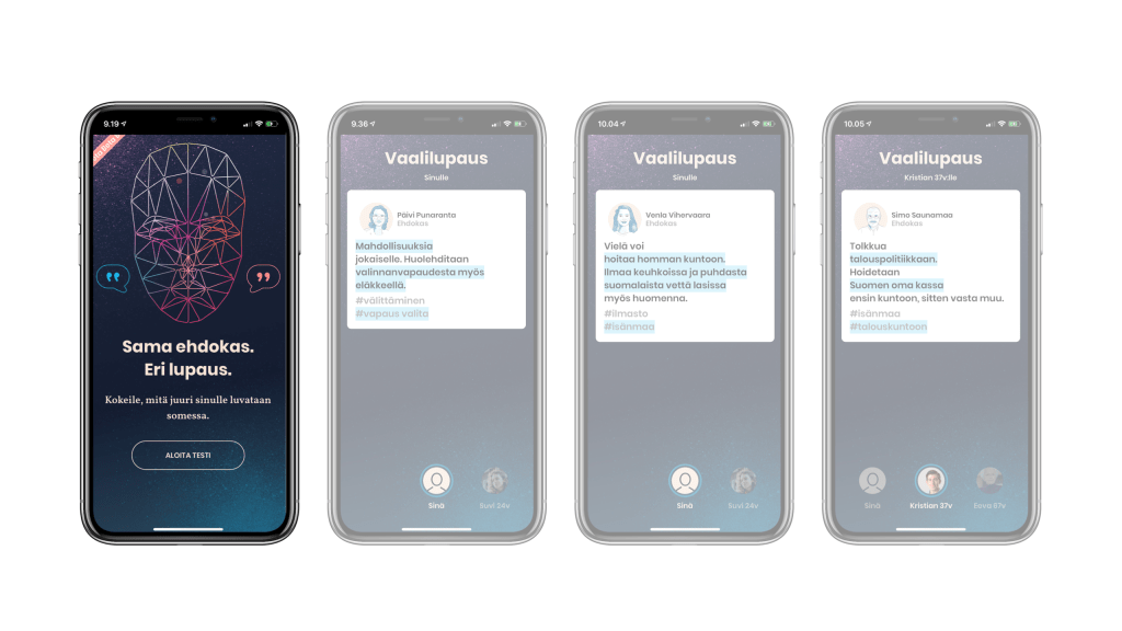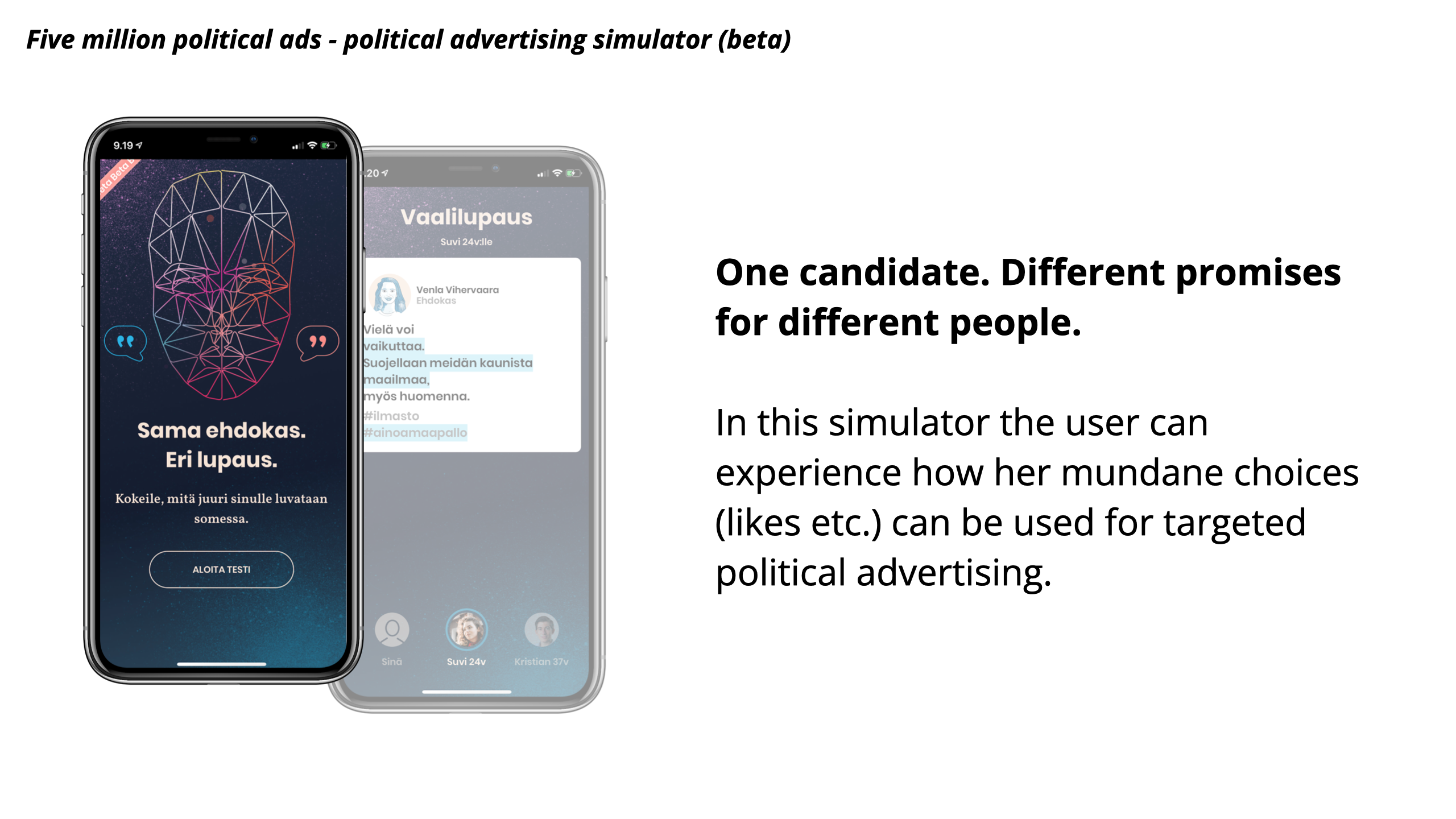 🤔 Key learnings: 1) Simplifying a very complex process of targeted political advertising was a great challenge for a newly formed multidisciplinary team. In this context, you need as a team to start by understanding the whole ecosystem—from political ideologies and their differentiating marketing messaging to the personalization methods used in social media—and then break it into comprehensible chunks for product design and development. 2) We wanted to create an experience that would let people without extensive background knowledge to understand the basics of targeted advertising. To achieve that, all complexity was hidden under the hood to mimic the people’s actual experience in social media.