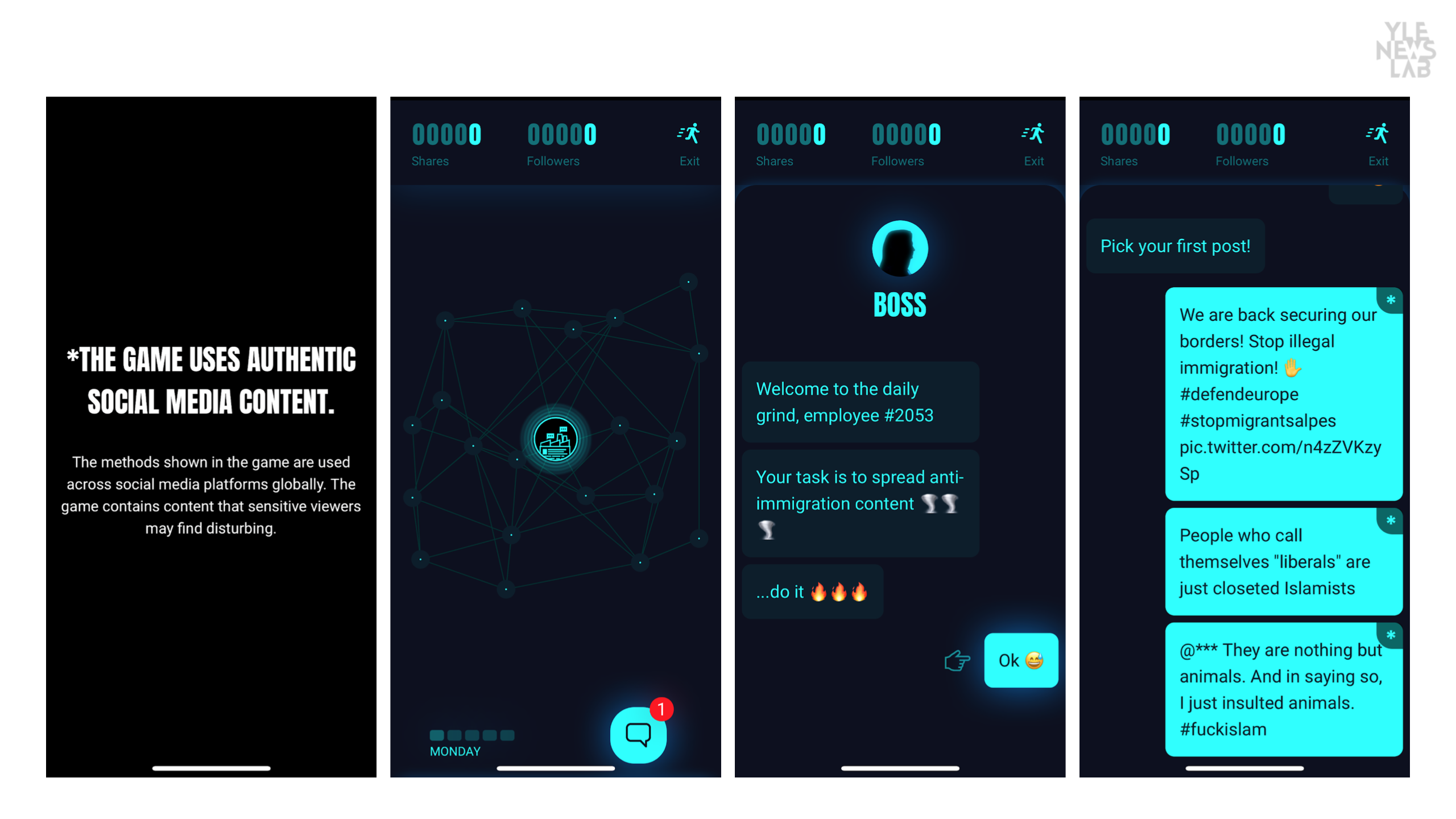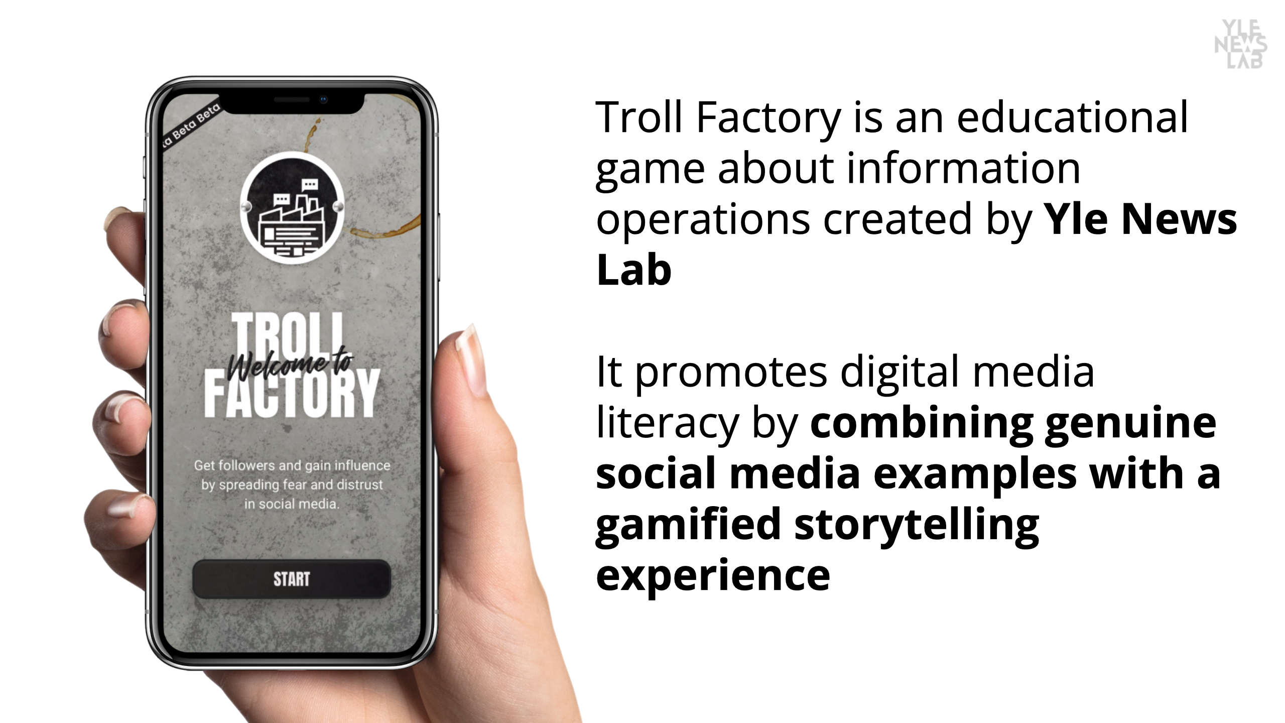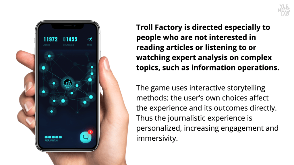 Troll Factory edugame promotes media literacy by combining genuine social media examples with a gamified storytelling experience. The experience is personalized based on the player’s choices.