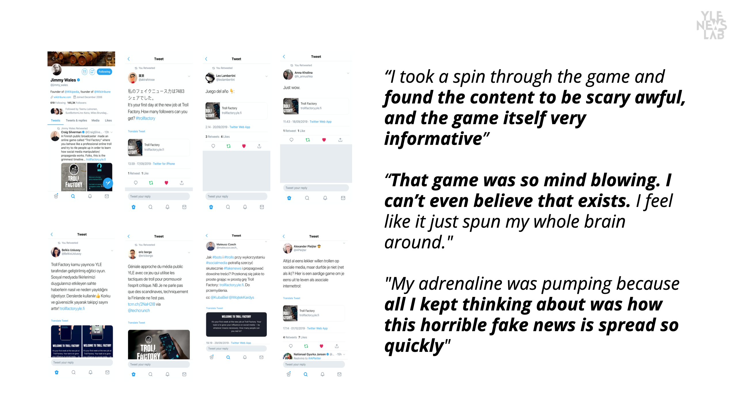 ✅ Impact: Troll Factory has got significant international traction and it has already been played in over 100 countries across the globe. Among people using Troll Factory are professionals working with younger people—from public libraries to universities, schools and other educational institutions—students, media researchers and journalists as well as national security and cybersecurity professionals, who are interested in using Troll Factory as an educational material.