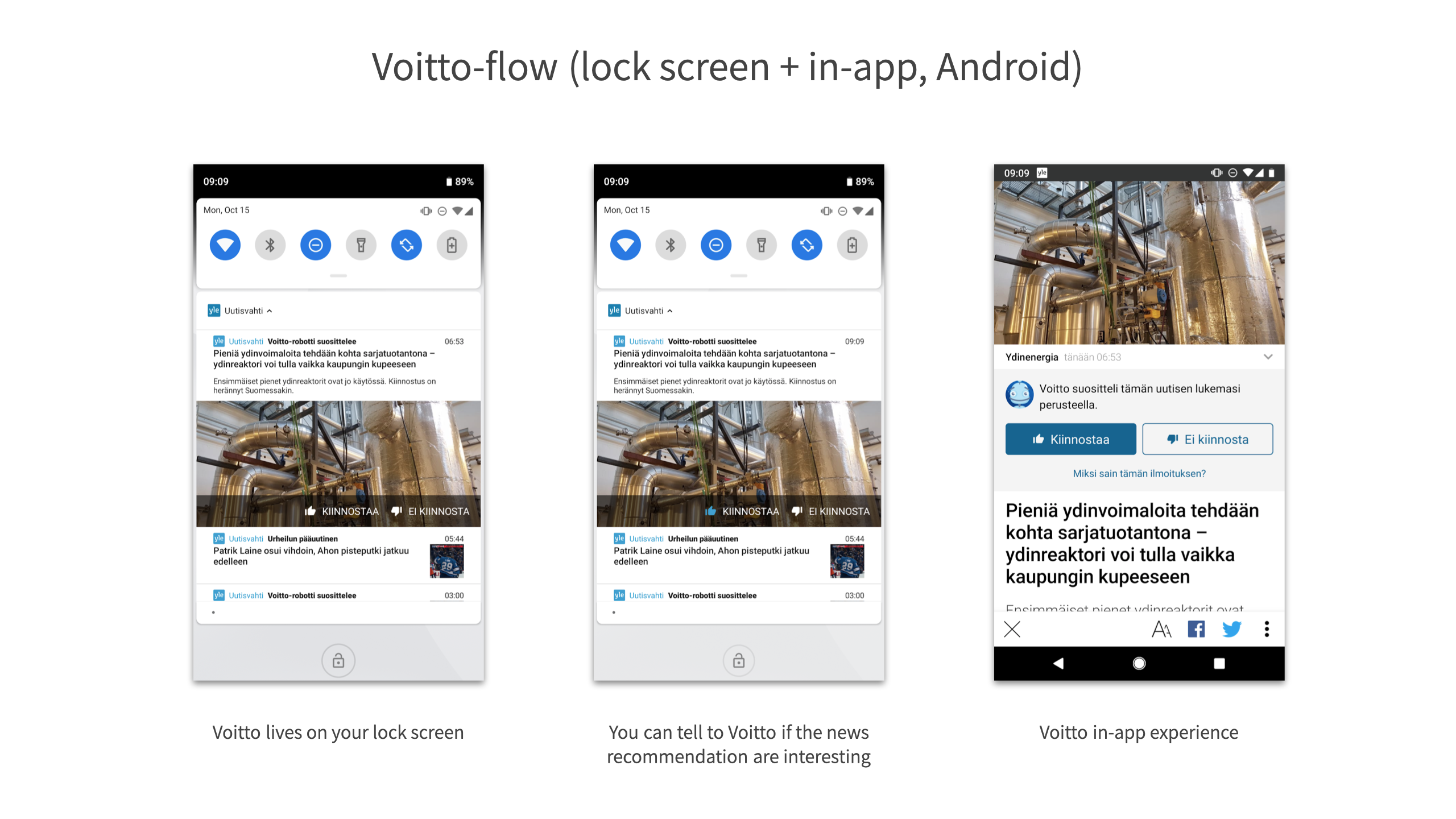 Voitto is the first smart news assistant in the world to appear and learn directly on your lock screen. The team set to create a human-centered and transparent personalization experience that would allow people themselves control how the news assistant works. The feedback loops for meaningful content recommendations had to be thought in a novel way to in order to let the user to interact with Voitto assistant directly on their mobile lock screen. Voitto’s user experience and its tone of voice in these interactions was a crucial element: news content can contain information that can be very emotional and even upsetting. Thus Voitto’s interactions were designed to work for varying news content recommendations, from sports results to big unexpected news events.