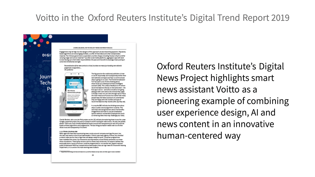 First in the world: Yle’s smart news assistant Voitto ensures that you don’t miss the news you want to read (2018) https://newslab.yle.fi/blog/16T3d1e7YcuwguOk8gsq8s